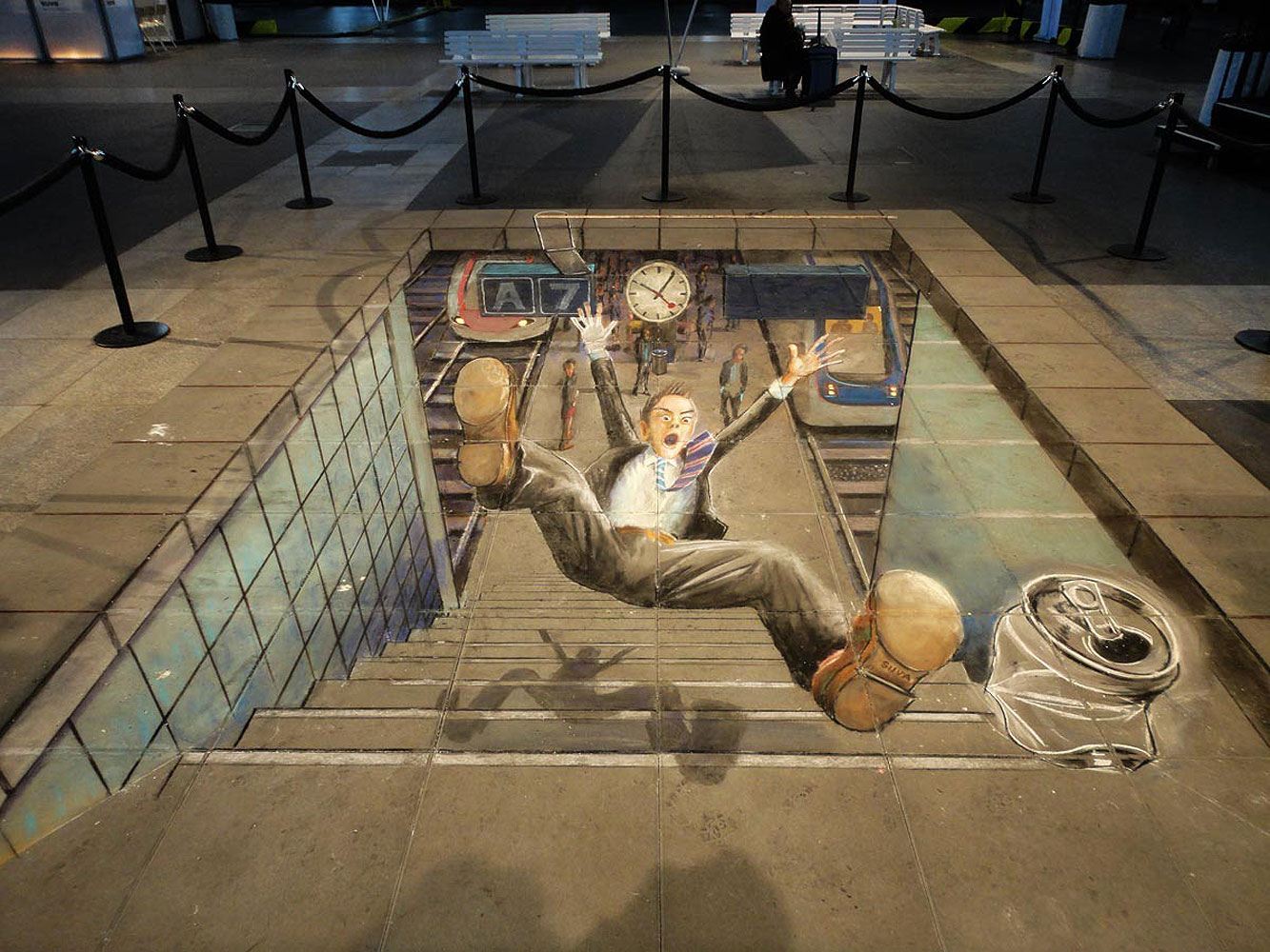 Julian Beever (ur. 1959) - brytyjski artysta, który od połowy lat 90. tworzy rysunki na nawierzchniach chodnikowych techniką artystyczną trompe-l'œil (z fr. "oszukać oko"). Wykorzystuje technikę projekcji zwaną anamorfozą, aby stworzyć iluzję trzech wymiarów widzianych pod odpowiednim kątem. Zachowuje swoje prace na zdjęciach, często umieszczając w obrazie przypadkową osobę tak, jakby wchodziła w interakcję ze sceną.