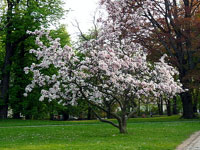 Na początku maja kwitną magnolie. Pierwsza połowa maja to pora kwitnięcia jabłoni purpurowych i wiśni japońskich. Nieco później zakwitają głogi. W dalszym ciągu kwitną drzewa i krzewy owocowe.
