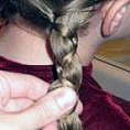 Schyl głowę w dół i zaczesz włosy do przodu. Pasmo włosów przy karku podziel na trzy równe części.